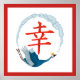 Colorful illustration features 'Happiness" Japanese calligraphy center with blue crane wreath, white background and red border.