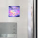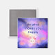 A magnet with an inspirational quote which says "do what makes you happy". Illustrated with a cute kawaii bunny face holding a heart. The background is an abstract watercolor painting with luminous space clouds in soft pastel colours.