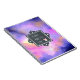 A spiral notebook with an inspirational quote which says "do what makes you happy". Illustrated with a cute kawaii bunny face holding a heart. The background is an abstract watercolor painting with luminous space clouds in soft pastel colours.