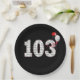 103rd birthday party with bold black and white happy and number 103 text on black with party balloon bouquet.