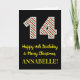 The front of this simple and fun Christmas themed and birthday themed December 25th birthday greeting card design features a large number "14", with a green/white/red stripes pattern. It also features the message "Happy 14th Birthday & Merry Christmas,", and an editable name. The background of the front is coloured black. The inside features a custom birthday greeting message, or could perhaps be cleared and left blank if a message is to be written by hand instead. A customizable birthday card like this might be a fun way to send a message in celebration of somebody’s fourteenth birthday that also falls on December 25th (Christmas Day). [~Z0000405]