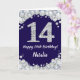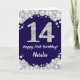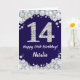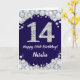Happy 14th Birthday Navy Blue and Silver Glitter Card with personalized name. For further customization, please click the "Customize it" button and use our design tool to modify this template.