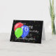 A birthday card for a Granddaughter's 16th birthday with a black background, a blue, red and green balloon and scattered swirls and stars.