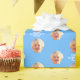 Personaized kid's photo birthday party wrapping paper with a face cut out and the message "happy 1st birthday". Design with a light blue background, and a happy birthday message. To change the colour please click the button to edit the design. To make the cut-out of the photo you can download any free mobile app, or use Canva, or Photoshop. The background needs to be transparent when uploading it.