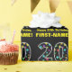 This fun birthday themed wrapping paper design features a large number "20", filled with a pattern of star shapes having various colours and sizes. It also features the message "Happy 20th Birthday,", and an editable name. The background is coloured black. Wrapping paper like this might be used when giving a gift or present in honour of somebody’s 20th birthday. [~Z0000429]