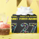 This fun birthday-themed wrapping paper design features a large number "27", filled with a pattern of decorative star shapes of various sizes and colours. It also features the message "Happy 27th Birthday,", and a customizable name. The background is coloured black. Birthday themed wrapping paper like this might be a fun way to wrap a gift or present being given to somebody who is celebrating their 27th birthday. [~Z0000429]