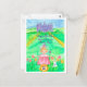 A sweet custom name happy birthday postcard featuring a baby princess in a soft pink dress standing in a happy wildflower patch with her bunny friend down the hill from the castle illustrated with watercolor. Fun card to customize for a special little girl!