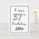 The front of this stylish Roaring Twenties art deco inspired birthday greeting card design features the message “Happy 37th Birthday,” along with a personalized recipient name. The number “37th” on the front has a fancy lined appearance, and there is also a lined border. The inside has an editable birthday greeting message, or could perhaps be cleared and left blank if a message is to be written by hand instead. A luxurious, personalized birthday greeting card like this might be sent in celebration of somebody’s thirty-seventh birthday. [~Z0000641]