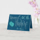 A design with ornate typography in dark colors for a 40th birthday. Happy Birthday is set in a decorative script in blue, and the age is in a cordinating style in soft teal, along with your recipient’s name, on a blue background. You can change the message inside to your own greeting. Faux sparkly teal balloons add the perfect finishing touch on the front! The same color blue background continues on the inside.