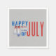 Patriotic paper party napkins features "Happy 4th of July" in red, white and blue text with "4th in a shimmery glitter fill".