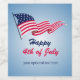 A patriotic red, white and blue, stars and stripes American flag swaying in the wind in a bright blue sky. Happy 4th of July in handwriting and extra space for your own text.