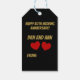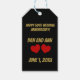 Happy 50th Anniversary gift tags on a black background with two red hearts. Customers can change the names and dates.