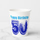 Blue text design for "Happy Birthday" with a digital relief effect. Design on paper cup with large 50 and first name to customize. You can easily change number and name (font, colour, size and position) and background colour by clicking the customize button. Matching birthday paper napkin and plate.