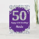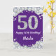 Happy 50th Birthday Purple and Silver Glitter Card with personalized name. For further customization, please click the "Customize it" button and use our design tool to modify this template.