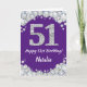 Happy 51st Birthday Purple and Silver Glitter Card with personalized name. For further customization, please click the "Customize it" button and use our design tool to modify this template.