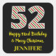 This fun and simple Christmas-themed and birthday-themed December 25th birthday sticker design features a large number "52" with a red/white/green stripes pattern, along with the message "Happy 52nd Birthday & Merry Christmas,", and a customizable name. The background is coloured black. Stickers like this might be fun to use when preparing gifts that are being given to somebody whose fifty second birthday falls on December 25th (Christmas Day). [~Z0000409]