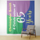 Celebrate a birthday with a personalised tapestry backdrop wall hanging showing recipient's name, and number of years. Party backdrop for a 65 year old.