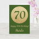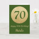 Happy 70th Birthday Green and Gold Glitter Card with personalized name. For further customization, please click the "Customize it" button and use our design tool to modify this template.