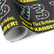 This fun birthday-themed wrapping paper design features a large number "73" filled with a pattern of decorative star shapes having various sizes and colours, along with the message "Happy 73rd Birthday,", and a personalized name. The background is coloured black. Birthday themed wrapping paper like this might be a fun way to wrap a gift or present being given to celebrate somebody’s seventy third birthday. [~Z0000429]