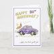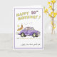 Funny greeting card for 80th birthday. Lady in old car with union jack headscarf racing off to enjoy her birthday.