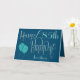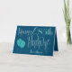 A design with decorative lettering in shades of blue for 85th birthday greetings. Happy Birthday is set in an elegant script in blue, and the age is in a cordinating style in soft teal, along with your recipient’s name, on a blue background. You can change the message inside to your own greeting. Faux sparkly teal balloons add the perfect finishing touch on the front! The same colour blue background continues on the inside.