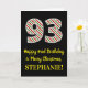 The front of this fun and simple Christmas themed and birthday themed December 25th birthday greeting card design features a large number "93" with a green, white, and red stripes pattern, along with the message "Happy 93rd Birthday & Merry Christmas,", and a customizable name. The background of the front is colored black. The inside features an editable birthday greeting message, or could perhaps be cleared and left blank if a message is to be written by hand instead. A custom birthday card like this might be a fun way to send birthday wishes to somebody who is celebrating their ninety third birthday and who was also born on Christmas Day (December 25th). [~Z0000405]