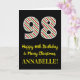 The front of this fun and simple Christmas themed and birthday themed December 25th birthday greeting card design features a large number "98", with a red/white/green stripes pattern. It also features the message "Happy 98th Birthday & Merry Christmas,", and a personalized name. The background of the front is colored black. The inside features an editable birthday greeting message, or could perhaps be cleared and left blank if a message is to be written by hand instead. A personalized birthday card like this might be a fun way to acknowledge somebody’s ninety eighth birthday that also falls on December 25th (Christmas Day). [~Z0000405]