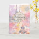 Wedding anniversary card to a special couple in soft pastel colours with a collage featuring the Eiffel Tower, flowers, leaves, and other watercolor marks.