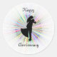 Remember the wedding of your dreams as he swept you off your feet. Say "Happy Anniversary" with this round sticker. Enjoy that day you whole life. The bride and groom silhouette in front of a rays of colour.
