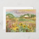 Bonne carte postale de voeux d'automne décorée d'un ranch paisible dans un paysage désertique au coucher du soleil avec des tournesols fleurissant le long de barbelés barbelés clôture peinte à la main avec de l'aquarelle.