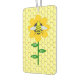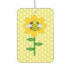 This awesome air freshener features a graphic image of a cute yellow bumblebee with black stripes, eyes, antennae and legs. It has pretty blue and white wings. The bee is sitting on the middle of a golden yellow sunflower. The flower has a green stalk and three leaves. The message "happy bee day" appears spread over the three leaves. The background is composed of a yellow honeycomb pattern.