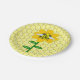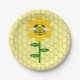 This awesome paper party plate features a graphic image of a cute yellow bumblebee with black stripes, eyes, antennae and legs. It has pretty blue and white wings. The bee is sitting on the middle of a golden yellow sunflower. The flower has a green stalk and three leaves. The message "happy bee day" appears spread over the three leaves. The background is composed of a yellow honeycomb pattern.