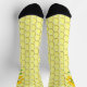 This awesome pair of patterned crew socks features a graphic image of a cute yellow bumblebee with black stripes, eyes, antennae and legs. It has pretty blue and white wings. The bee is sitting on the middle of a golden yellow sunflower. The flower has a green stalk and three leaves. The message "happy bee day" appears spread over the three leaves. The background is composed of a yellow honeycomb pattern.