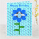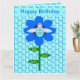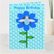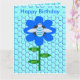 This fun Birthday card features a graphic image of a cute blue bumblebee with bright blue stripes, black eyes, blue antennae and black legs. It has pretty blue and white wings. The bee is sitting on the middle of a pretty blue sunflower. The flower has a green stalk and three leaves. The message "Bee Day boy" appears spread over the three leaves. The background is composed of a pale blue honeycomb pattern.