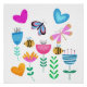 A cute design of a whimsical garden of colourful flowers, bees and butterflies