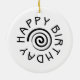 An attractive happy birthday ornament with circular text and a spiral motif.