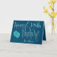 An elegant design of ornate typography in masculine colours for an 18th birthday. Happy Birthday is set in a decorative script in blue, and the age is in a cordinating typeface in soft teal, along with your recipient’s name, on a blue background. You can change the message inside to your own greeting. Faux sparkly teal balloons add the perfect finishing touch on the front! The same colour blue background continues on the inside.