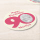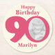 90th birthday party paper coasters. Great to add a personal touch to a surprise birthday party. Personalize with your birthday girls photo in the 0 of 90 and customize with your own name. Design by Sarah Trett.