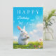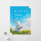 A sweet spring scene featuring a cute bunny holding a birthday cake under a bright blue sky, with delicate Easter details. Perfect for celebrating a birthday that falls near Easter with one cheerful card.