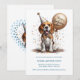 This beagle puppy dog is sure to be a hit with everyone; this beagle is trained to sit, stay, obey, hold a balloon and play party animal, like it's a birthday. This beagle puppy has tan markings over white with a black nose, he's also dressed with a colourful party hat and bow tie, with confetti falling all around. And you'll find customizable text templates for making this an easy to do invitation.