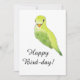 This is a birthday card that has a beautiful green bird in the picture. The card make a lighter mood by placing a pun.