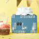 White Happy Birthday text on blue background with black balloons, sparklers, and candle.