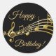 Black background with faux gold music notes. With the text: Happy Birthday! Golden hand lettered style script.