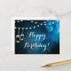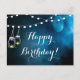 A romantic dark and blue evening and night with a full moon and light strings. Two painted mason jars with candles. With the text: Happy Birthday!