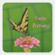 This happy birthday sticker features a pretty butterfly gathering nectar from a pink zinnia in a Connecticut garden.