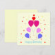 Carte d'anniversaire colorée et joyeuse avec des ballons en forme de coeur et des étoiles sur jaune clair. Rouge, Bleu, Jaune, Rose