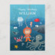This cute Happy Birthday Postcard features a brave little diver boy exploring an underwater world. He is surrounded by the various undersea animals: octopus, shark, crab, jellyfish, corals. All aquatic animals are very friendly and smiling. Great Card to send on the occasion of boy's birthday, especially if the kid is interested in underwater life.