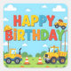 Happy birthday construction builder theme with little builder vehicles and hat.