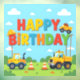 Happy birthday construction builder theme with little builder vehicles and hat.