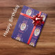 Elegant and stylish personalized "happy birthday" wrapping paper with coquette bow custom name and custom photo on blue background with golden tiny stars. Perfect for a girl's birthday.